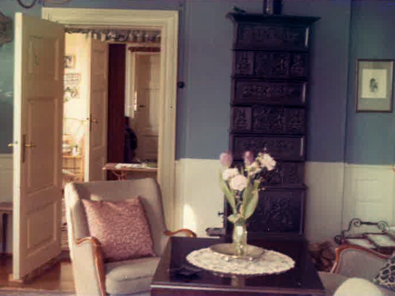 Mor fortalte at da stuen ble malt blå, måtte malermesteren overbevise farmor om at den mørke fargen ville gjøre stuen elegant. Det ble den, fordi det hvite brystpanelet [5] kom bedre til sin rett. Mor nevnte samtidig at fordi huset var fredet, var det strengt med hensyn til hva man fikk endre innendørs. Uavhengig av om dette medfører riktighet, tillot senere reguleringsvedtak at interiøret ikke ble tatt vare på.