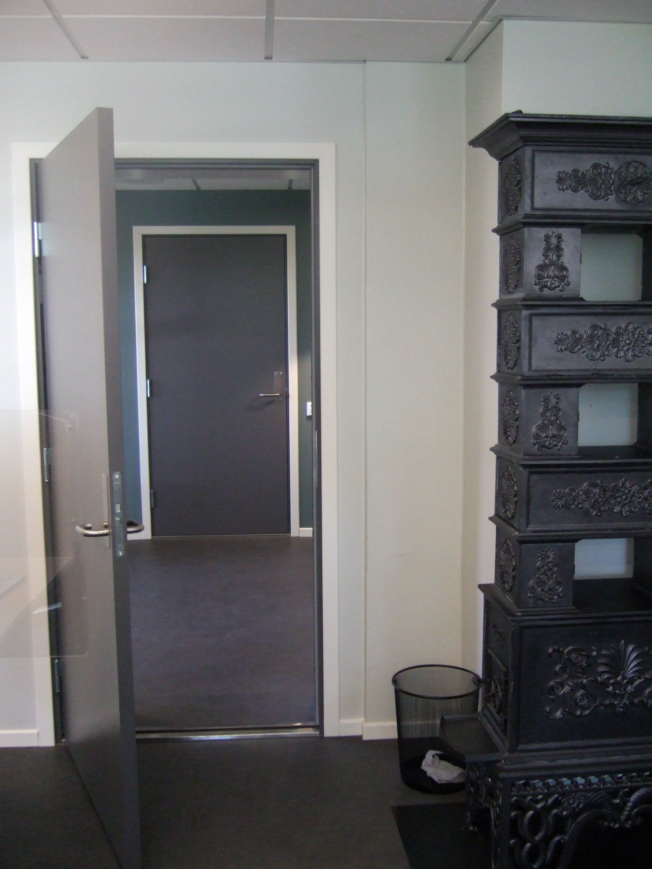 Hovedinngangsdøren er splitter ny og en nøyaktig kopi av den gamle. Riktignok mangler det tidligere dørhåndtaket og beslaget i messing, som fulgte den originale døren helt til dens endelikt for få år siden. Døren av i dag har et mer moderne, men likevel elegant håndtak.