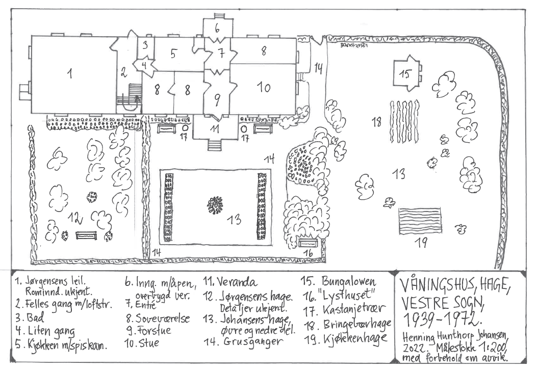 Hagen til farmor og farfar er selvsagt ikke mer. Foran sin del av huset hadde de en nærmest parkmessig opparbeidet hage, som i det store og hele sikkert var det opprinnelige hageanlegget. De høye, gamle kastanjetrærne, ett på hver side av verandaen, en hvit benk under hvert tre og den nærmest kvadratiske plenen innrammet av grusganger og med et rundt blomsterbed i midten og rektangulære bed på to av sidene, utgjorde en vakker symmetri. Det høyre kastanjetreet (sett fra hagen mot huset) delte seg i to tykke grener og det venstre i fire. Trærne flettet seg i hverandre og dannet et høyt løvtak over verandaen og de to benkene på bakken. Mot Jørgensens hage var en høy hekk, mot sørvest – og utsikten – en lav.
