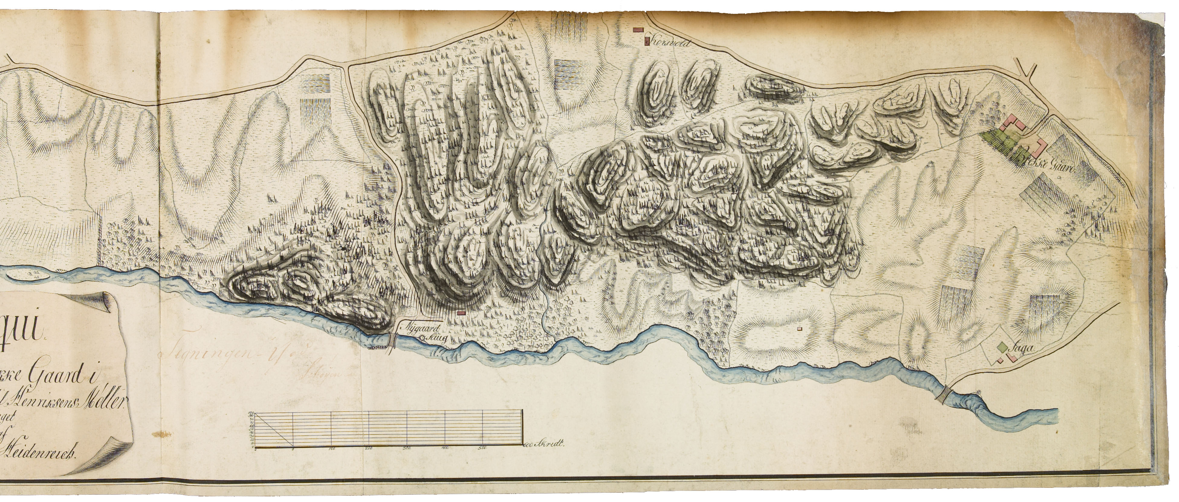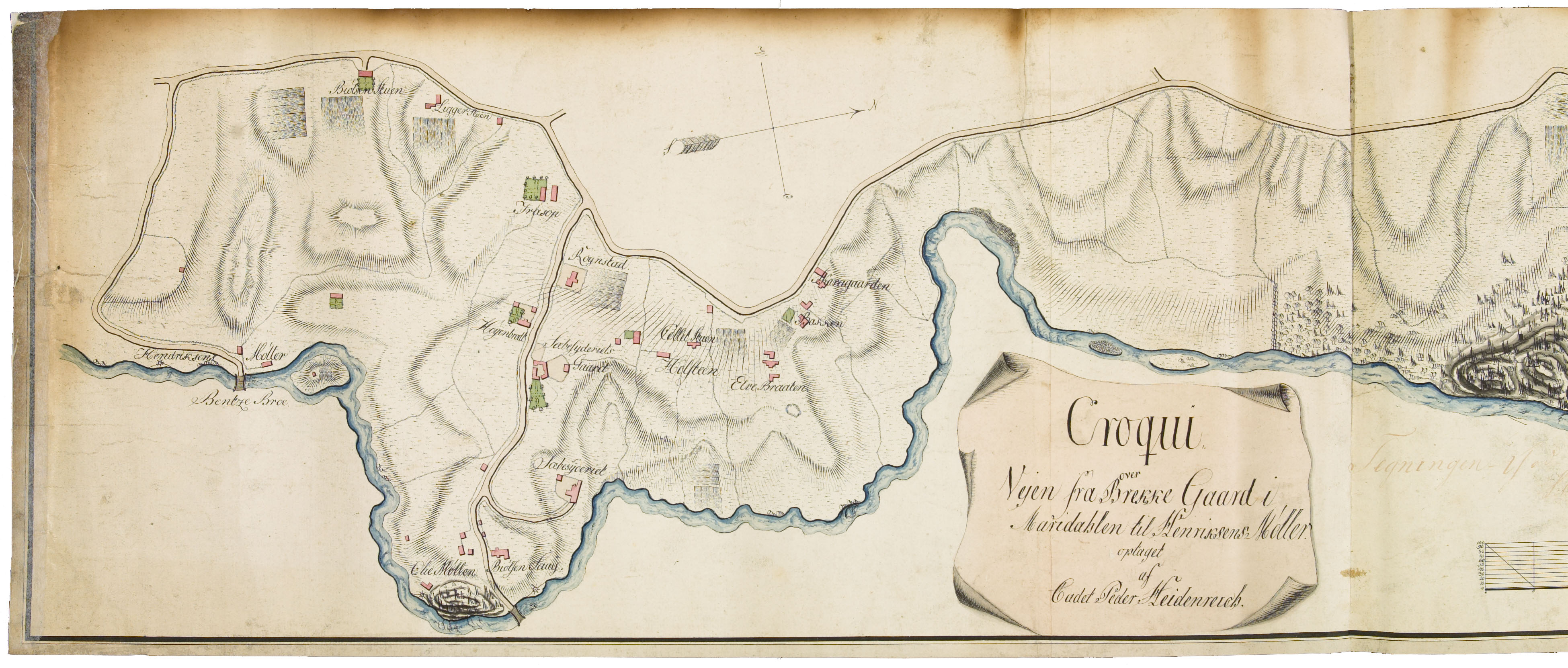 Kartet nedenfor er tegnet av kadett Peder V. Heidenreich i 1806. Han var elev ved skolen mellom 1801 og 1807, og kartet viser veien langs Akerselva fra Henriksens Møller ved Bentsebrua til Brekke gård i Maridalen. Kartet er typisk for hvordan kadettene tegnet topografi mot slutten av 1700- og tidlig på 1800-tallet. Typisk for militære kart er også at bygningene er fargelagt rosa.
