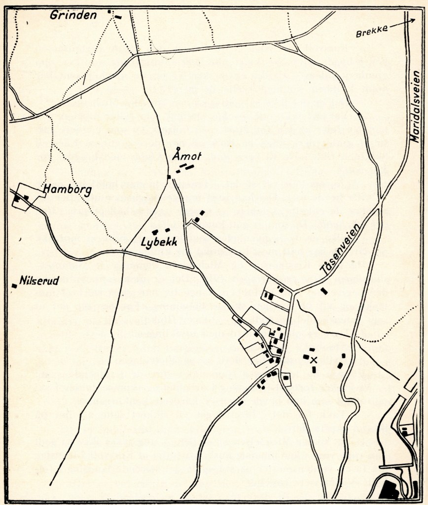 I Oslo byleksikon heter det at husmannsplassene lå rundt det tidligere krysset i Maridalsveien/Tåsenveien. Fire av plassene ble uttrykkelig kalt Korsvolden/ Korsvoll. Nordre Korsvolden lå under Brekke i Tåsenveien 131, mens Søndre lå under Nygård i Skibakkveien 10. Vestre Korsvolden lå i Korsvollbakken 27. I tillegg fantes rett og slett bare Korsvoll under Brekke gård i Tåsenveien 112. Av alle disse er det kun bebyggelsen i Skibakkveien 10 som er bevart med våningshus (fra 1860) og låve. Andre plasser var Lybekk, Langaas og Åmot. Åmot lå under Bakke gård, som hadde en mindre teig, nord for Nordre Taasens område.