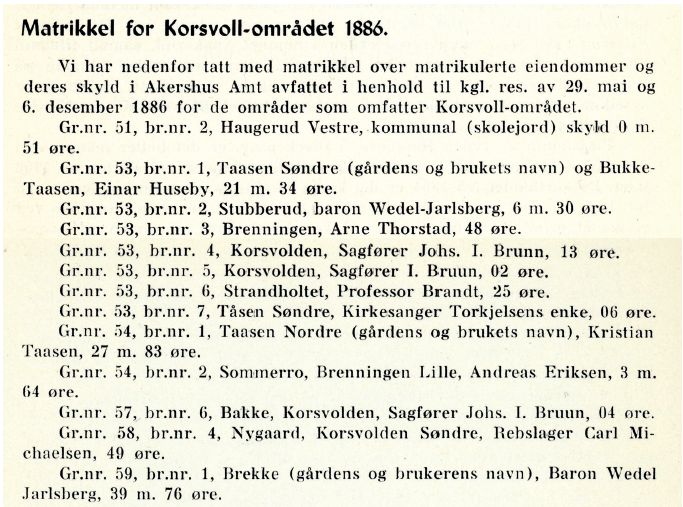 Norges bondelags kart over gårdsgrenser i 1886 viser at hele Korsvoll lå på gårdsgrunn den gang, bortsett fra enkelt, mindre utskilte parseller. I Korsvoll Idrettslag jubileumshefte fra 1949, er det fremlagt en oversikt over matrikkelen i 1886. Her fremgår det at Korsvollområdet tilhørte gårdsbrukene, Taasen, Bakke, Nygård og Brekke. Nordberg, gnr. 52/1 er ikke listet opp, men faktisk en utskilt skoleparsell av Haugerud Vestre, gnr. 51/2, som lå nedenfor Sognsvann. Haugerud skolekrets var stor og omfattende på den tiden, og inkluderte også barn på Korsvoll. Ved nedleggelsen i 1905 ble Korsvollbarna overført til Grefsen og Kjelsås.