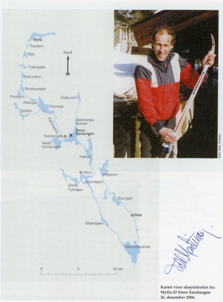 Ivar og Tore hadde motvind over Mylla, men kom seg raskt sydover, først til Ølja, så til Tverrsjøen, Skarvvannet, Buvann, Pershusvann og Finntjern. Mellom hvert vann skiftet de fra skøyter til sko og løp. I sydenden av Tverrsjøen traff de et par mannfolk med barn. Ellers var ingen andre å se. I smalet i nordenden av Pershusvannet var det tynn is, og de stoppet litt og vurderte forholdene. Men da de så ferske skøytespor foran dem, fulgte de raskt etter. De passerte Finnstad, hvor Ivar fortalte at han kjente mennesker som oppholdt seg der. Syd i Finntjern fikk de et nytt, skummelt isparti, men kom seg greit over. Tore la merke til at Ivar var svært forsiktig og tilbakeholden på disse partiene, og gikk gjerne på land langs med isen. Fra Finntjern tok de en islagt skiløype ned til Aklangen. Her falt Tore og slo seg kraftig i hofta. Ivar ble bekymret, men de fortsatte greit videre til smalet inn i Katnosa. Her var også isen tynn. Det knaket i den, men igjen fulgte de skøytesporene fra tidligere på dagen. Katnosa gikk greit, og ved Leveringsvika så de noen pilkere.