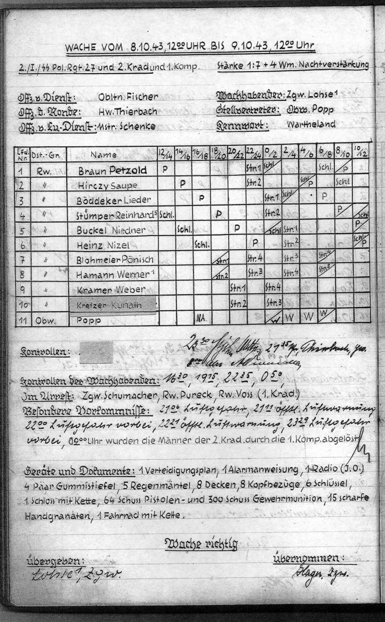 «um 2000 Uhr wurden die Arrestanten: Wagner, Schløgler und Høringhlie den Beauftragter ihrer Einheiten übergeben (vergasung der Arrestzellen). Vorstehend genannte 3 Arrestanten wurden am 3.8.43, 8 Uhr die Wache vieder übergeben.»