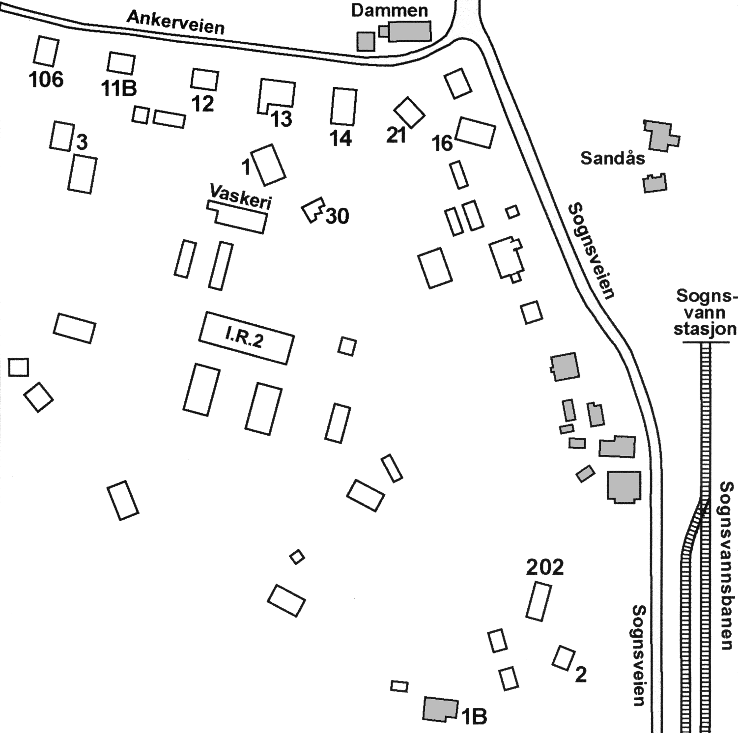 Historien om Sognsvannsleiren nærmer seg slutten. En del brakker står der fortsatt, men fremtiden for området er allerede be23 stemt. I arkivet på Idrettshøyskolen finner vi et kart som forteller om tre perioder. Brakker som allerede er revet nevnes med de siste leieboere. Enkelte brakker og de opprinnelige kafeer og hus står der fortsatt, mens den planlagte Idrettshøyskole dominerer området. På kartet er også nevnt brakkenes siste leietakere. Langs Ankerveien finner vi Fru Asborg Rohde, Aksel Kolberg, H. Sitter, gullsmed Sørensen, sekretær Waldenstrøm,T Brynlund og Oslo Kommune. Langs Sognsveien er det Christiania Spigerverk, Per Øvergård, Pastor Günther og Bogdanoff & Andresen som er leietakere. Inne på området finner vi Sverre Jørgensen, Harald Solberg, Lars Stølen, Trygve Høidahl, Fabricius & sønner A/S. Frelsesarmeen, Olav Foss og Kringsjå Gartneri v/J.C. Kongsli.