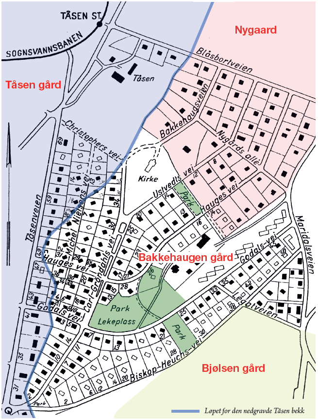 Da det ble laget planer til Bakkehaugen villaby, i begynnelsen av 1930 årene, lå bekken som en åpen renne over området. Bekken var opprinnelig skille mellom Søndre Tåsen gård og Bakke (Bakkehaugen).