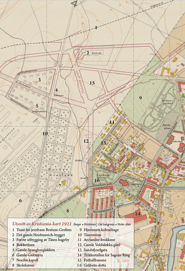 Men legg merke til den sorte stiplete linjen øverst på kartet. Det er den planlagte toglinjen Bestum–Grefsen. Denne togplanen lå som en demper for utviklingen av området fra 1901 til 1960, og bevirket at Voldsløkka ikke ble nedbygget.