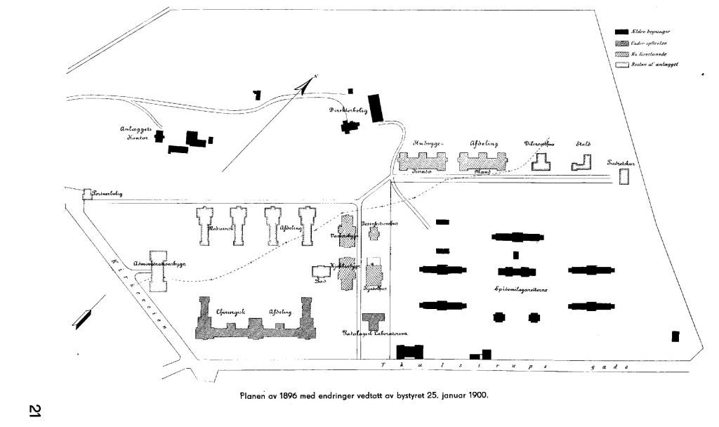 Ser man på oversiktstegningen av sykehuset, ser man hvor stor del av tomten denne gamle avdelingen opptar! Og hvor hensiktsmessig er disse bygningene etter 135 år?